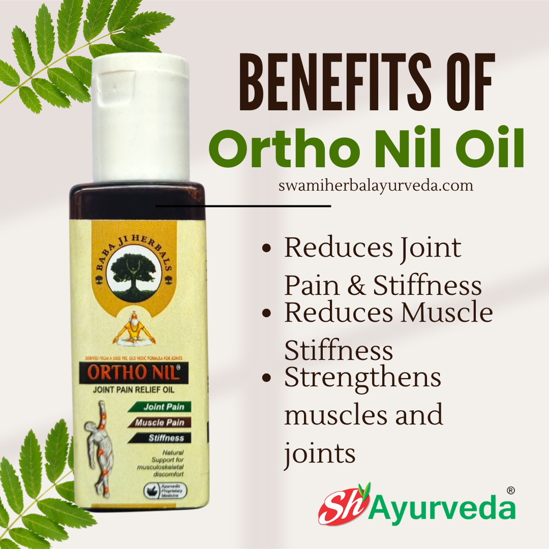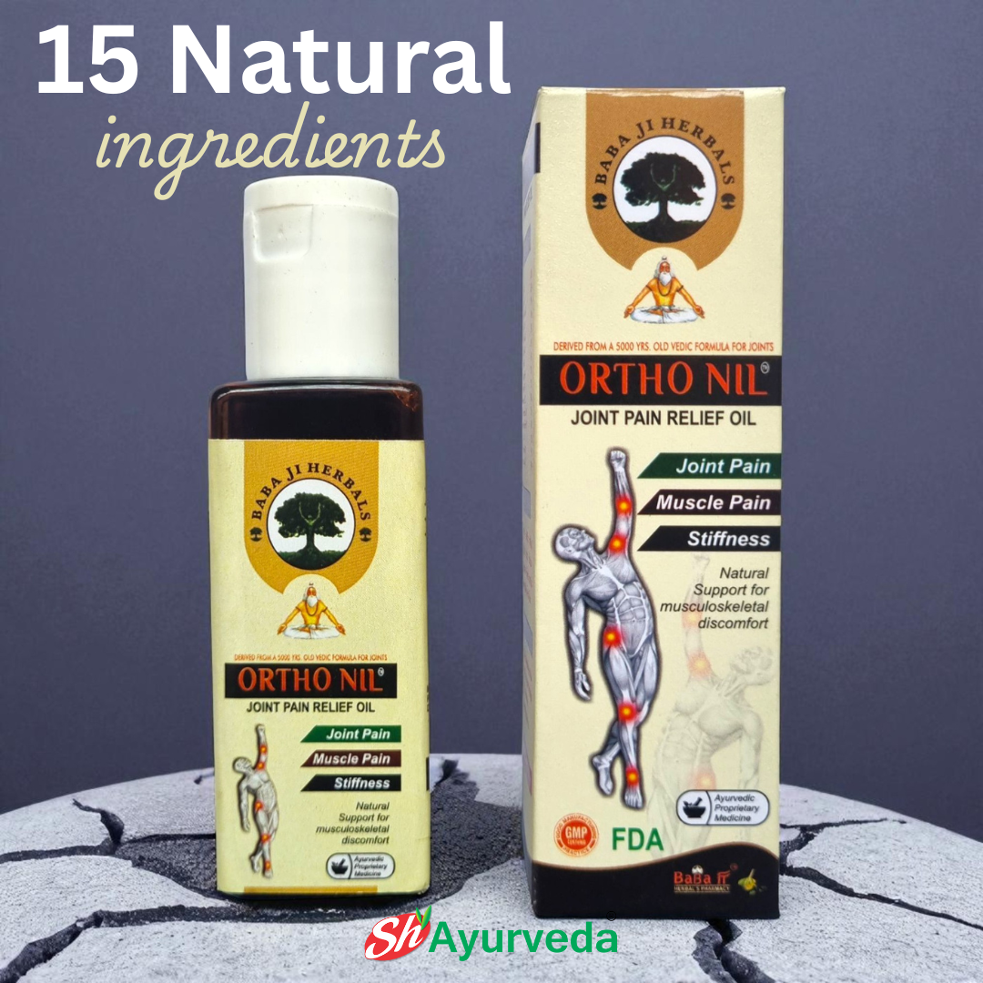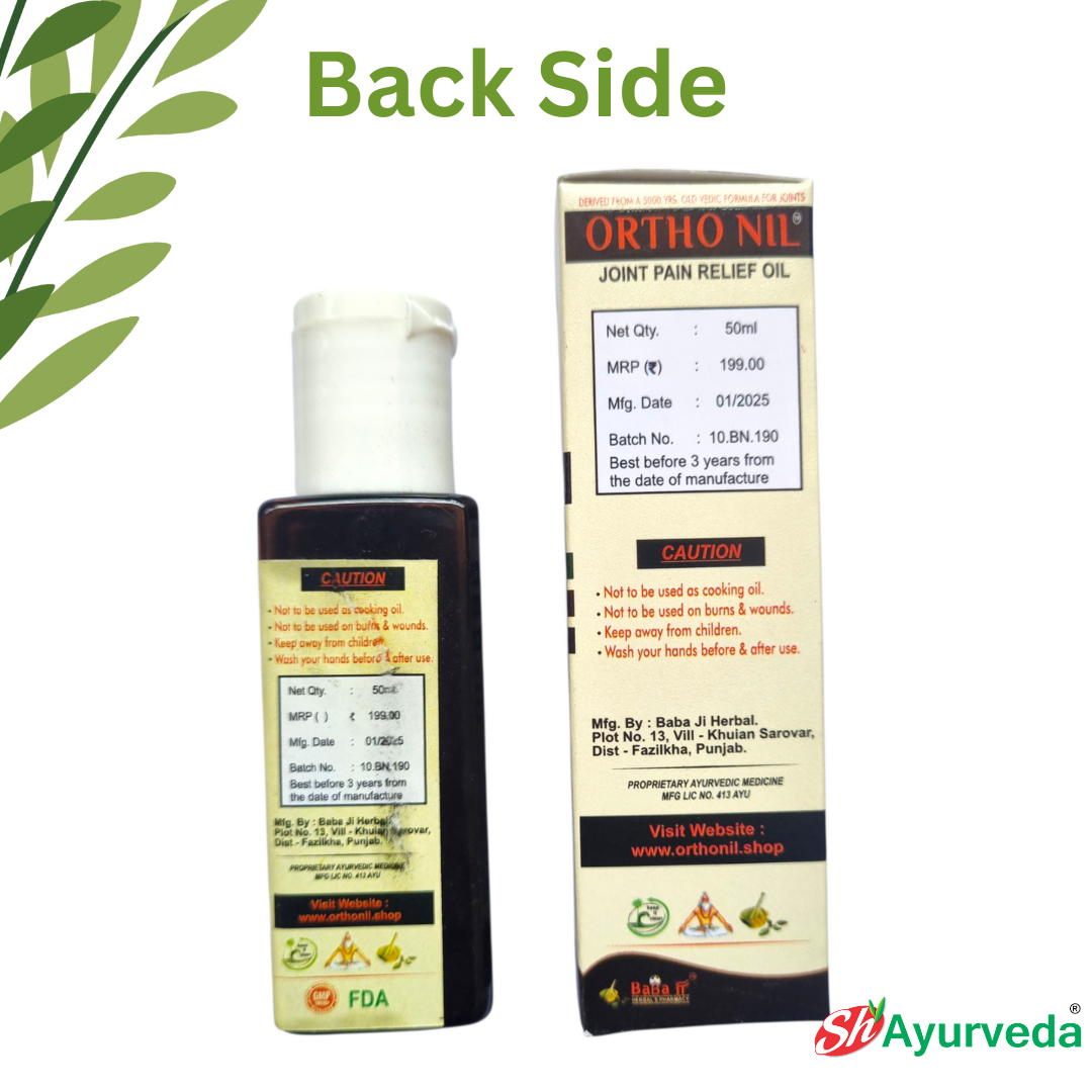 Experience the power of Ayurveda with Ortho Nil Joint Pain Relief Oil, a proprietary medicine from the trusted house of Baba Ji Herbals in Punjab. Crafted with a 5000-year-old Vedic formula, this 100% natural oil is your go-to solution for finding relief from a variety of joint and muscle discomforts.